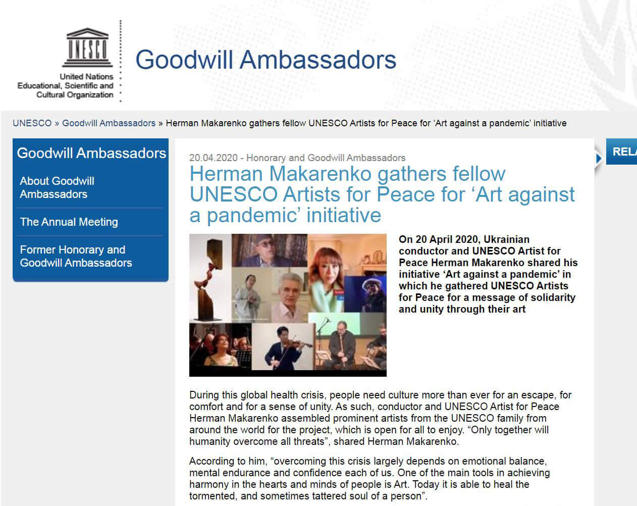 During this global health crisis, people need culture more than ever for an escape, for comfort and for a sense of unity. As such, conductor and UNESCO Artist for Peace Herman Makarenko assembled prominent artists from the UNESCO family from around the world for the project, which is open for all to enjoy. “Only together will humanity overcome all threats”, shared Herman Makarenko.